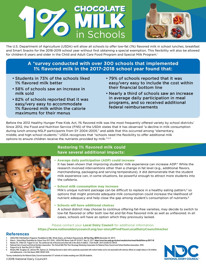 The USDA allows low-fat (1%) and fat-free (skim) chocolate and other flavored milks in schools and states “flavored milk has received high palatability ratings from children and has been shown to encourage milk consumption among school-aged children. Studies indicate that children drink more flavored milk than unflavored milk, and that flavored milk served in the school meal programs is wasted less than unflavored milk.” Furthermore, studies show that consumption of flavored milk is associated with better overall diet quality without any adverse impact on weight.